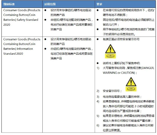 紐扣或硬幣電池可以在各種各樣的產(chǎn)品中找到,包括兒童玩具、照明產(chǎn)品、遙控器、手表等。電玩具一般使用的紐扣/硬幣電池為扁平的圓形單電池,厚度從1-11毫米不等,直徑可達32毫米。在玩耍電玩具時,兒童如果不慎吞食紐扣/硬幣電池后可導致窒息甚至死亡。2020年12月22日,澳大利亞政府正式生效4個強制標準來減少因使用紐扣/硬幣電池造成的傷亡風險。強制性標準包括18個月過渡期,從2022年6月22日開始,供應商必須符合該標準要求。