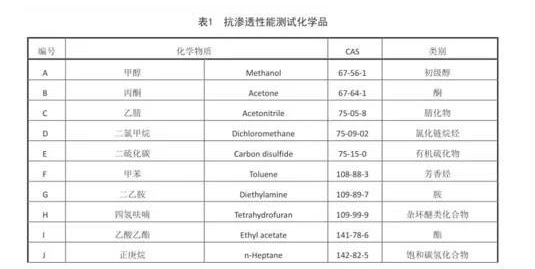 抗滲透性能一直是化學品防護手套的重要技術參數。GB 28881-2012 版標準要求采用了12種測試化學品種類,并根據產品的要求選取 3 種化學品進行測試并分級,而抗滲透性能測試方法則引用了 GB/T 23462-2009《防護服裝 化學物質滲透試驗方法》。